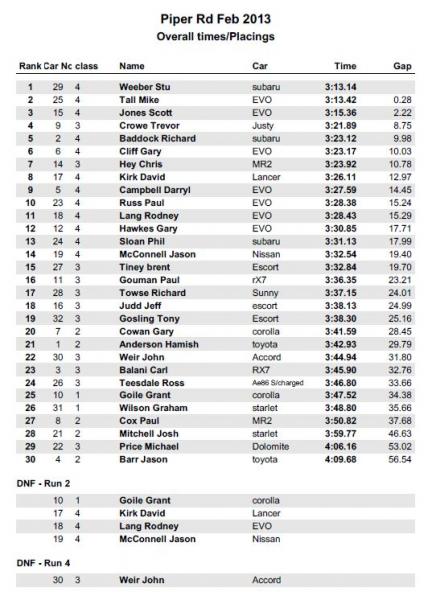 Trevor Crowe had finished third overall the previous day at the Sealed Qualifier Round and was very fast at Piper Valley Rd as well, with 3.34:80 in the first run in the Justy. Chris Hey was next 2WD, 7 seconds back in his Nissan turbo powered MR2, with Brent Tiney and Tony Gosling close behind Hey in their BDA’s.