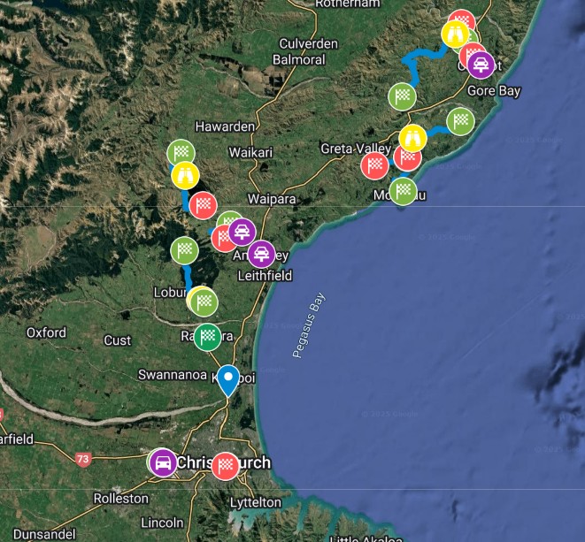 - SS2, Happy Valley Rd which starts at the Motunau beach end at 9:46 and is 18.43 km looping back to Motunau Beach Rd via Glendhu Rd. This is great piece of road not used for many years. Then a tour up SH1 with a remote refuel, over the Hurunui bridge turning immediately left into Ethelton Rd for